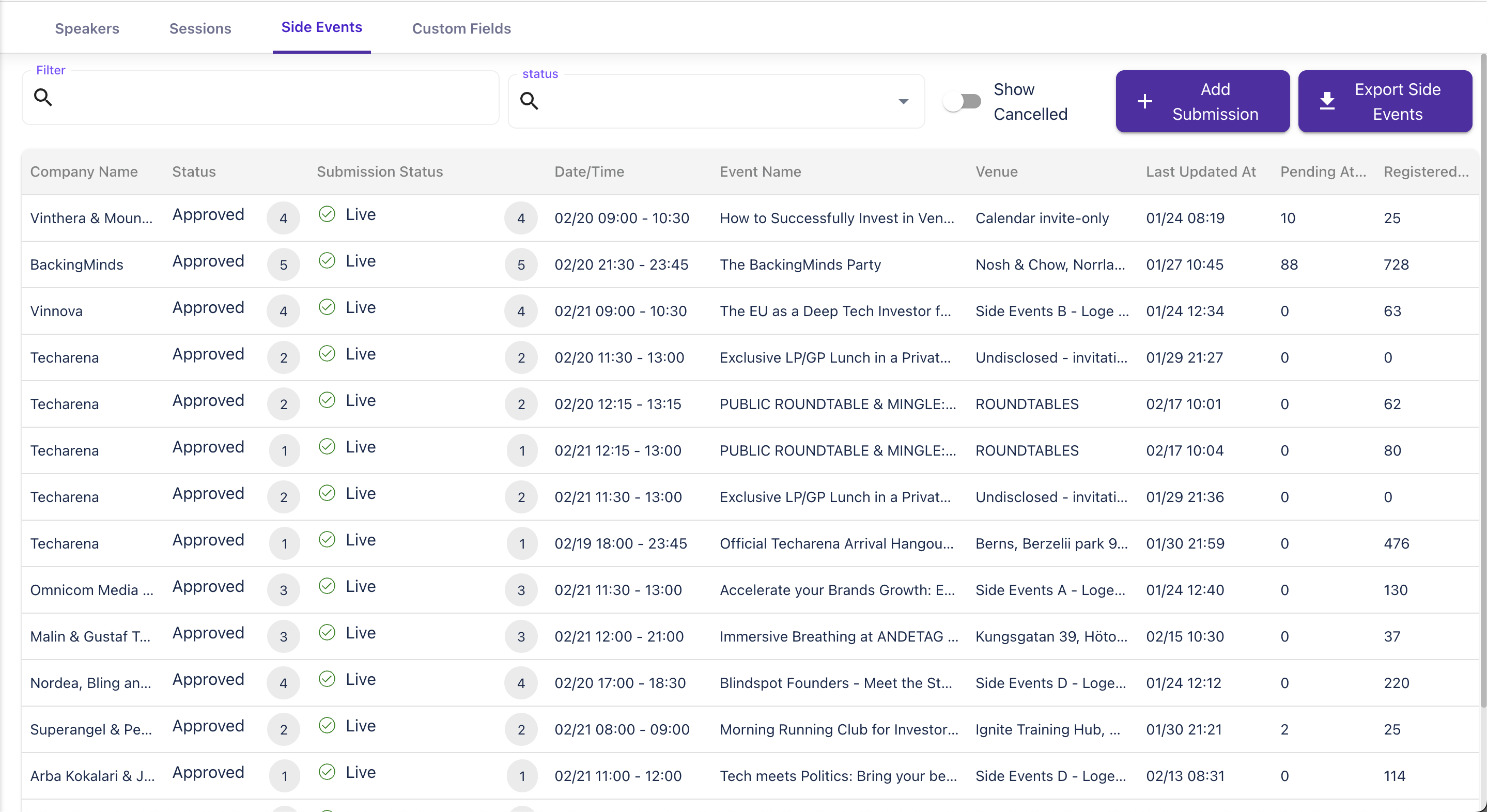 - View Overview and Statuses: You will see an overview of all side events in your event, with statuses such as Pending, Live, and Rejected.