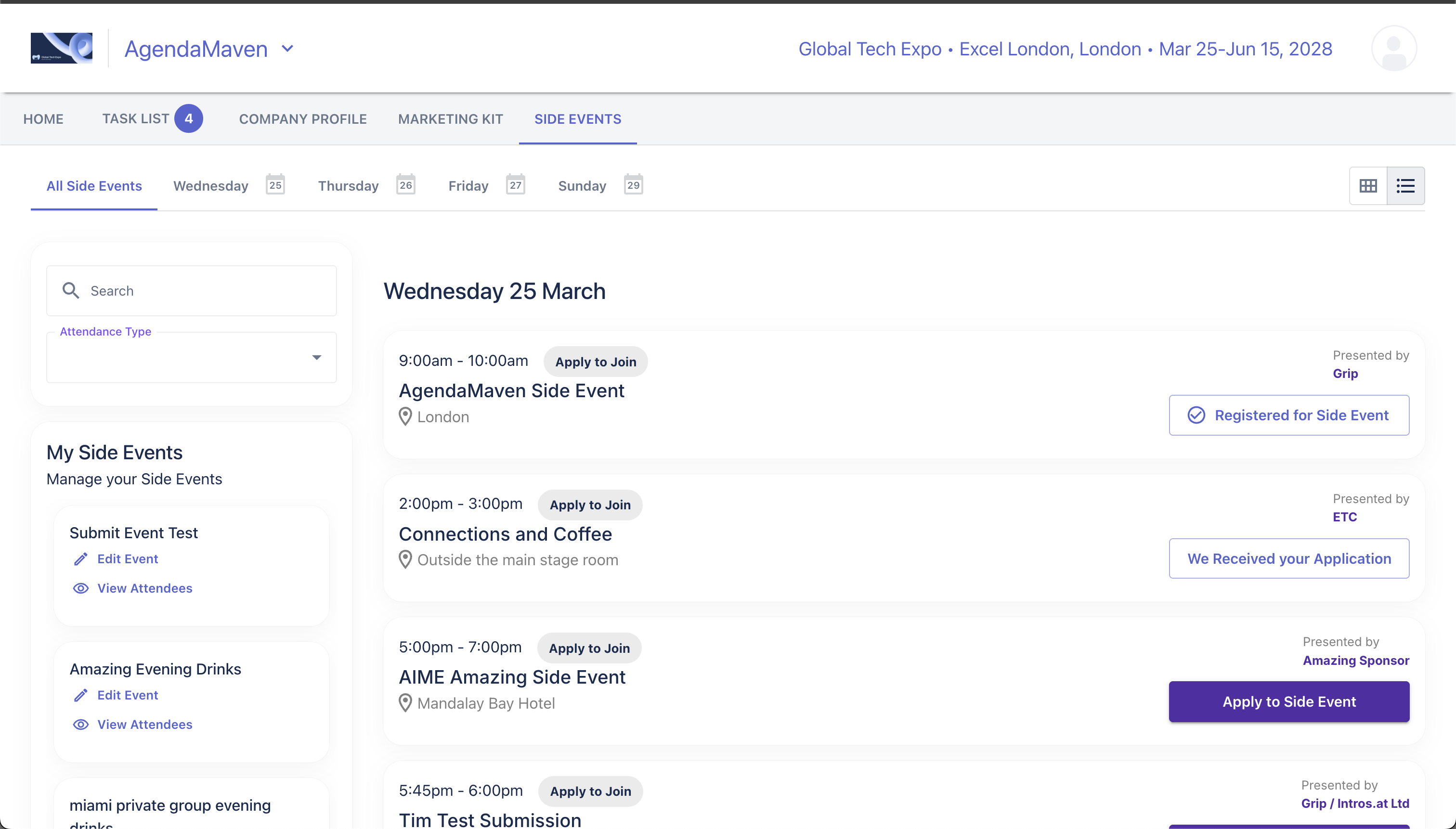Important Note: Side events are currently displayed in their own separate side event agenda. They are not yet shown within the My Schedule or the Main Event Agenda in the Grip Engage mobile app or web app. This keeps the distinction between the official agenda and the side event agenda clean.