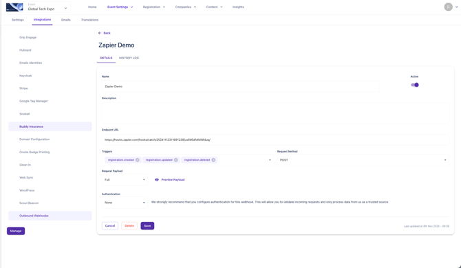 registration.created,registration.updated, andregistration.deleted. - Payload Format: Choose between a simple ID or a full payload.