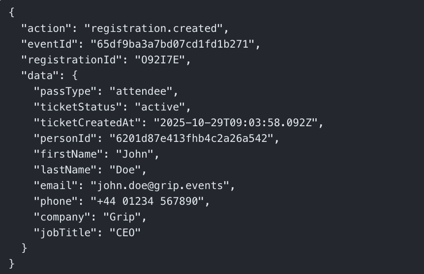 registrationId,eventId,action, and adataobject containing key information from the person and ticket documents. This can include PII data likefirstName,lastName,email,phone,company, andjobTitle.