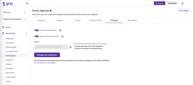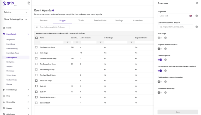 The Event Agenda page can be found under the "Event Details" tab in the Grip Engage Admin. It is simple to navigate, with five main sections at the top: Sessions, Stages, Tracks, Roles, Settings, and Attendees.