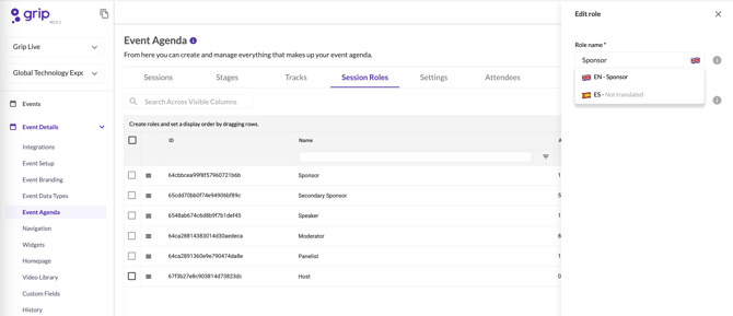 2. Roles are multilingual, and by clicking on the little flag icon, you can change the language to any other supported by the event.