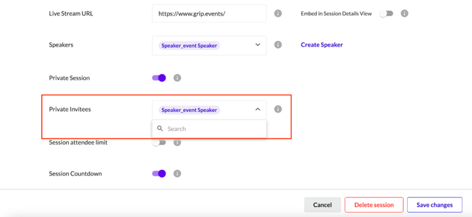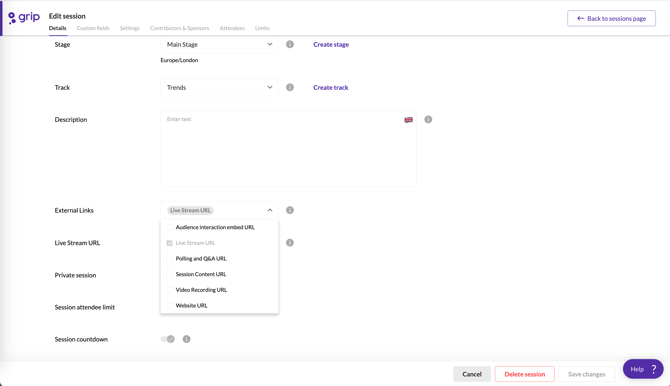 4. Fill out the 'Session details' page as you would with a 'Standard session' shown in the section above. Please note, in order for a speaker to get the speaker view you must add them as a 'speaker' in the Grip Engage Admin.